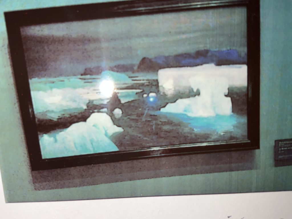 There is a painting of ice berg floating on the sea. It looks great when the sky is dark and the ice blends with the ocean.