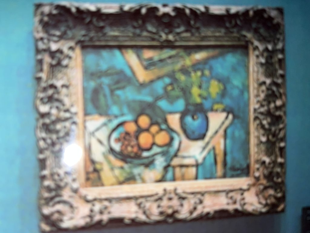 Now this painting is a picture of a vase with plants, next to oranges and grapes on a plate. The blue background blends with the blue wallpaper of the museum.
